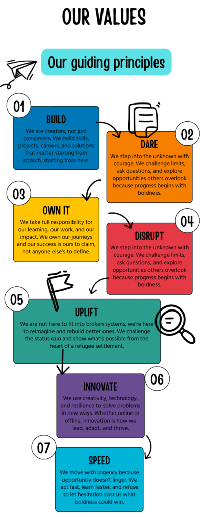 Our team is made of people who think, build and teach. Every person here carries a sense of responsibility for Nakivale. We care about learning, creativity and useful work. Our ain is to grow people who can build things that matter for themselves and for this place and can stand anywhere they go next.